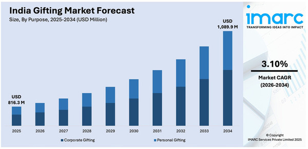 The India gifting market size reached USD 816.3 Million in 2025. Looking forward, IMARC Group expects the market to reach USD 1,089.9 Million by 2034, exhibiting a steady growth rate (CAGR) of 3.10% during 2026-2034.